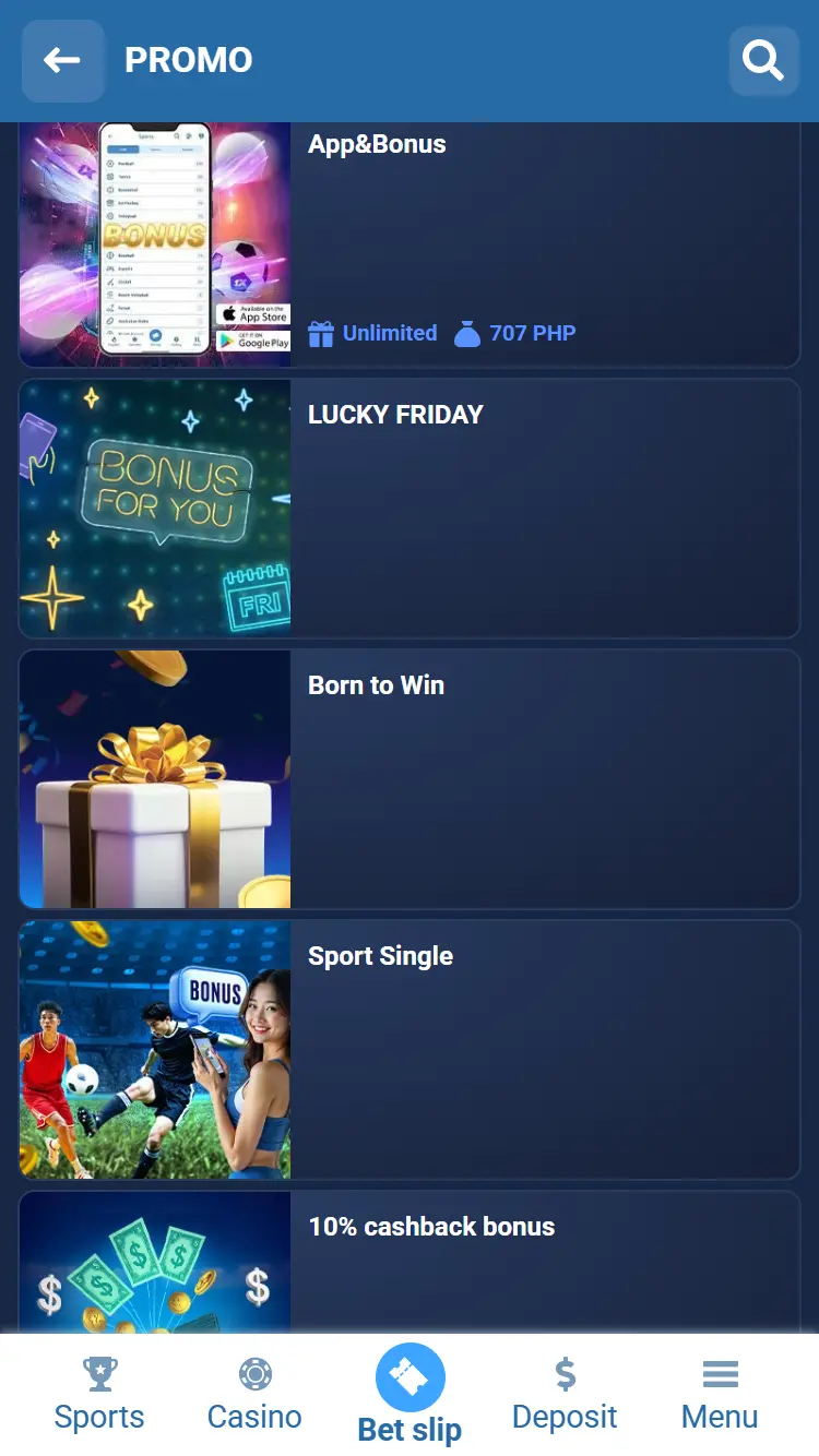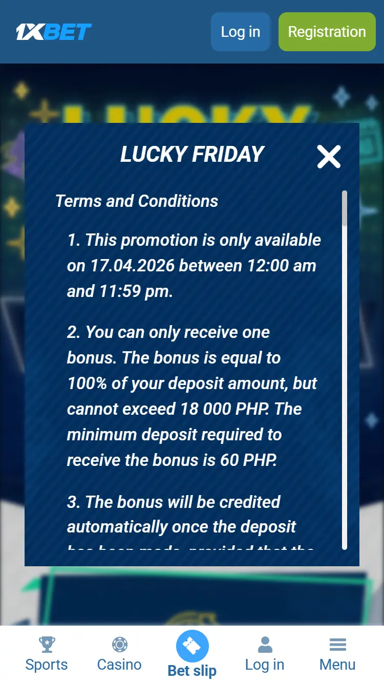 On the 1xBet Philippine website, the “Lucky Friday” bonus is offered as a 100% match on deposits ranging from 60 to 18,000 PHP, with a 3x wagering requirement on accumulator bets within 24 hours.